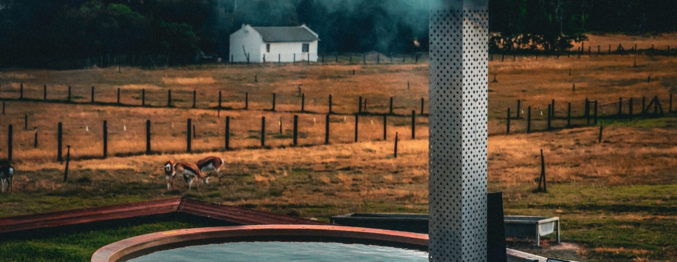 The farmhouse’s standout feature is its charming courtyard, equipped with a built-in braai, boma, and pizza oven. Outside, the expansive "stoep" provides breathtaking views, perfect for sundowners while lounging by the pool or Kolkol hot tub.