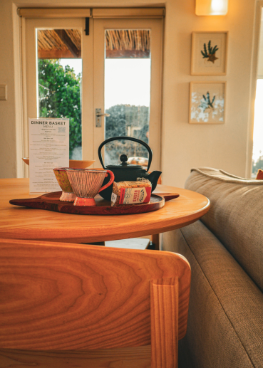 Even dinner was next level. Our meal arrived beautifully presented in glass containers inside a woven basket, ready to heat and enjoy. The tableware was exquisite, adding a special touch to the experience. Every detail, from the décor to the natural materials and sketches, blended seamlessly with the surroundings.